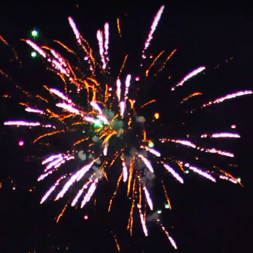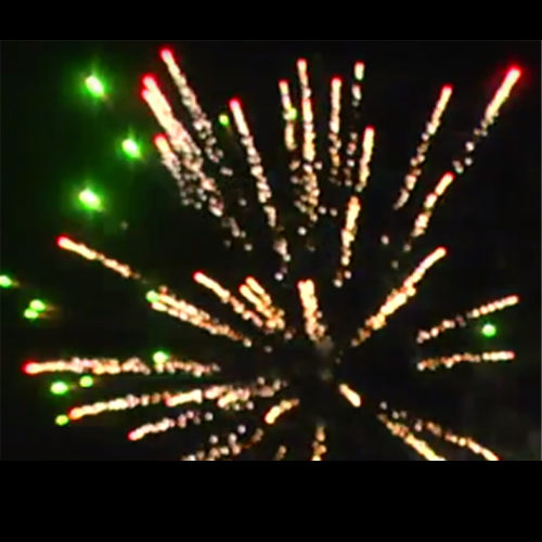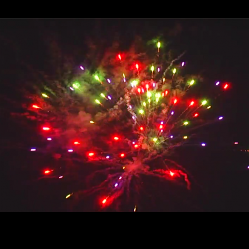 Пируэт из разноцветных корон и пальм, сопровождается трещащими искорками и цветными пионами.